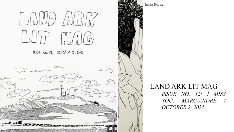 Alright, I admit some of it. This may not be the most massaged issue. I may have gotten weighleighed by some west-coast highway nymphs, seduced by a few big breakfasts, digested one or two under-maintained outhouses and maybe, just maybe, I lost track of time. Uh oh and oh well, but thank my swim shorts we have such a dependable team. What I do not admit is any kind of dip in quality, as previously reported by a news outlet that shall-not-be-named. Journalists are scummy boys who take the news way too seriously. Report on fiction, damnit! This issue is magnificent! But also maybe a little messy, un-beautiful, floppy, buoyant only by blowing, slightly witty and all around worrying. I wouldn’t have it any other way! Hail Land Ark Lit Mag! Hail!